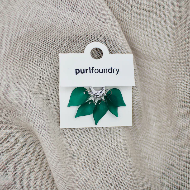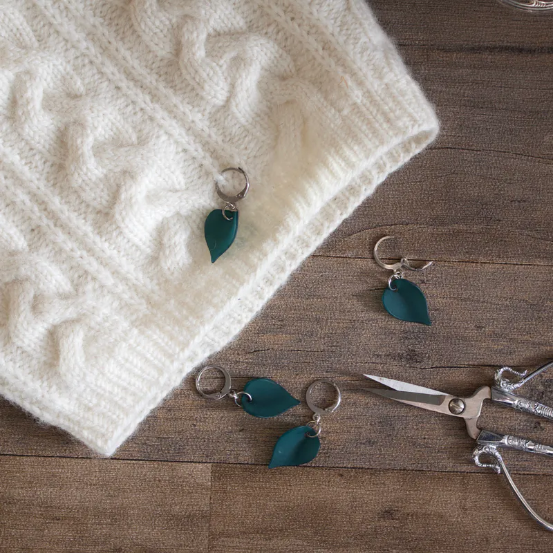 Removable markers for knitters who love calming vibes. These green leaf-shaped removable markers come in a set of five and are made with lightweight acrylic. The leaf colour is a cool-toned forest green in a matt finish and each marker is attached to a metal clasp. The photo of the markers on a wooden surface with white knitting is the most accurate in terms of colour.